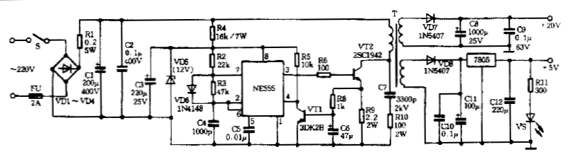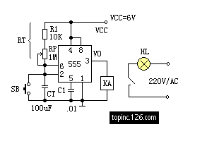 | 选择分类:当前分类——常用资料 相关联或者相类似的文章: 电子线路中的噪声(511) BA1404调频立体声发射芯片的原理与应用(511) BA1404/1404F 调频立体声发射电路(511) 健忘(510) 用PROTEL DXP电路板设计的一般原则(510) 业余条件下制作电路板七种方法(509) 电子元器件基本常识:常见的液晶显示器(509) 电热毯自动保护恒温器(509) 10. 00-99计数器(509) 利用TL431作大功率可调稳压电源(509) 数字化的优点(508) 也能称为“公益事业”(508) 半导体二极管的基本知识(508) 婚前婚后(508) 什么是闪存和缓存(508) BH1417的高保真锁相环调频立体声发射模块(508) 实用电工速算口诀集(507) 怎样用多个开关控制一盏灯(507) 密封铅酸蓄电池充电器设计实例(506) 浅谈干簧管的应用(506) 首页 前页 后页 尾页 本站推荐: | 555时基电路原理以及应用 555内部电原理图 ![]() 我们知道,555电路在应用和工作方式上一般可归纳为3类。每类工作方式又有很多个不同的电路。 在实际应用中,除了单一品种的电路外,还可组合出很多不同电路,如:多个单稳、多个双稳、单稳和无稳,双稳和无稳的组合等。这样一来,电路变的更加复杂。为了便于我们分析和识别电路,更好的理解555电路,这里我们这里按555电路的结构特点进行分类和归纳,把555电路分为3大类、8种、共18个单元电路。每个电路除画出它的标准图型,指出他们的结构特点或识别方法外,还给出了计算公式和他们的用途。方便大家识别、分析555电路。下面将分别介绍这3类电路。 单稳类电路 单稳工作方式,它可分为3种。见图示。 第1种(图1)是人工启动单稳,又因为定时电阻定时电容位置不同而分为2个不同的单元,并分别以1.1.1和1.1.2为代号。他们的输入端的形式,也就是电路的结构特点是:“RT-6.2-CT”和“CT-6.2-RT”。 ![]() 第2种(图2)是脉冲启动型单稳,也可以分为2个不同的单元。他们的输入特点都是“RT-7.6-CT”,都是从2端输入。1.2.1电路的2端不带任何元件,具有最简单的形式;1.2.2电路则带有一个RC微分电路。 ![]() 第3种(图3)是压控振荡器。单稳型压控振荡器电路有很多,都比较复杂。为简单起见,我们只把它分为2个不同单元。不带任何辅助器件的电路为1.3.1;使用晶体管、运放放大器等辅助器件的电路为1.3.2。图中列出了2个常用电路。 ![]() 双稳类电路 这里我们将对555双稳电路工作方式进行总结、归纳。555双稳电路可分成2种。 第一种(见图1)是触发电路,有双端输入(2.1.1)和单端输入(2.1.2)2个单元。单端比较器(2.1.2)可以是6端固定,2段输入;也可是2端固定,6端输入。 ![]() 第2种(见图2)是施密特触发电路,有最简单形式的(2.2.1)和输入端电阻调整偏置或在控制端(5)加控制电压VCT以改变阀值电压的(2.2.2)共2个单元电路。 ![]() 双稳电路的输入端的输入电压端一般没有定时电阻和定时电容。这是双稳工作方式的结构特点。2.2.2单元电路中的C1只起耦合作用,R1和R2起直流偏置作用。 无稳类电路 第三类是无稳工作方式。无稳电路就是多谐振荡电路,是555电路中应用最广的一类。电路的变化形式也最多。为简单起见,也把它分为三种。 第一种(见图1)是直接反馈型,振荡电阻是连在输出端VO的。 ![]() 第二种(见图2)是间接反馈型,振荡电阻是连在电源VCC上的。其中第1个单元电路(3.2.1)是应用最广的。第2个单元电路(3.2.2)是方波振荡电路。第3、4个单元电路都是占空比可调的脉冲振荡电路,功能相同而电路结构略有不同,因此分别以3.2.3a 和3.2.3b的代号。 ![]() 第三种(见图3)是压控振荡器。由于电路变化形式很复杂,为简单起见,只分成最简单的形式(3.3.1)和带辅助器件的(3.3.2)两个单元。图中举了两个应用实例。 ![]() 无稳电路的输入端一般都有两个振荡电阻和一个振荡电容。只有一个振荡电阻的可以认为是特例。例如:3.1.2单元可以认为是省略RA的结果。有时会遇上7.6.2三端并联,只有一个电阻RA的无稳电路,这时可把它看成是3.2.1单元电路省掉RB后的变形。 以上归纳了555的3类8种18个单元电路,虽然它们不可能包罗所有555应用电路,古话讲:万变不离其中,相信它对我们理解大多数555电路还是很有帮助的。 各种应用电路 555触摸定时开关 集成电路IC1是一片555定时电路,在这里接成单稳态电路。平时由于触摸片P端无感应电压,电容C1通过555第7脚放电完毕,第3脚输出为低电平,继电器KS释放,电灯不亮。 ![]() 当需要开灯时,用手触碰一下金属片P,人体感应的杂波信号电压由C2加至555的触发端,使555的输出由低变成高电平,继电器KS吸合,电灯点亮。同时,555第7脚内部截止,电源便通过R1给C1充电,这就是定时的开始。 当电容C1上电压上升至电源电压的2/3时,555第7脚道通使C1放电,使第3脚输出由高电平变回到低电平,继电器释放,电灯熄灭,定时结束。 定时长短由R1、C1决定:T1=1.1R1*C1。按图中所标数值,定时时间约为4分钟。D1可选用1N4148或1N4001。 相片曝光定时器 附图电路是用555单稳电路制成的相片曝光定时器。用人工启动式单稳电路。 工作原理: 电源接通后,定时器进入稳态。此时定时电容CT的电压为:VCT=VCC=6V。对555这个等效触发器来讲,两个输入都是高电平,即VS=0。继电器KA不吸合,常开点是打开的,曝光照明灯HL不亮。 ![]() 按一下按钮开关SB之后,定时电容CT立即放到电压为零。于是此时555电路等效触发的输入成为:R=0、S=0,它的输出就成高电平:V0=1。继电器KA吸动,常开接点闭合,曝光照明灯点亮。按钮