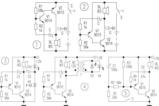 | 选择分类:当前分类——小说笑话 相关联或者相类似的文章: 感光线路板的制作技巧(103) ATX电源辅助电路原理与检修(101) 三菱 PLC梯型图(指令编码)反汇编程序-----开源 PLC 编程重点参考资料 (99) 简易8路数显抢答器制作过程(99) Cookies常用命令简介(99) 某君上馆子去吃鲱鱼(99) 三菱FX系列PLC编程口通信协议总览(99) [精]5分钟编写一个ASP论坛(99) 方便、实用、小巧的摄像头照相、录像软件(99) 80后从盗卖脏物到人间蒸发赖帐逃欠款(99) 一名漂泊在外的蚁族写给父亲的忏悔信(99) 如何节约程序开发中的时间(99) 四芯耳机插头(95) AT89C系列单片机加密方式(94) 加入本站送创业资金!绝对真实(93) 用互补管制作电灯轻触开关(93) 认为本站产品价格贵的朋友必看(91) 电子工程师面试常被问到的问题(89) 简单实用的遥控开关(85) 各地消费者协会网址、投诉电话一览表(82) 首页 前页 后页 尾页 本站推荐: | 讯响器和LED点亮实验 2003年,第9期,类别:电子技校 1. 电路简介。 图1是讯响器(又称音频振荡器、信号发生器)的典型电路。按图在面包板上连好电路,当电容器C从3.3nF~100μF取不同的值时,扬声器可发出不同的音调响声,将C定在47nF左右,改变R1的值,扬声器的发声音调也可发生变化。注意R1不可太小,一般应大于1kΩ,否则易使V1损坏。如果万用表的两表笔并接在R1的两端,量程选择旋钮放在交直流电压的不同挡位转动,也可使扬声器的发声音调发生变化。将图1的V1和V2换一下位置变成图2电路,也有相同效果。 1、 本站不保证以上观点正确,就算是本站原创作品,本站也不保证内容正确。 2、如果您拥有本文版权,并且不想在本站转载,请书面通知本站立即删除并且向您公开道歉! |