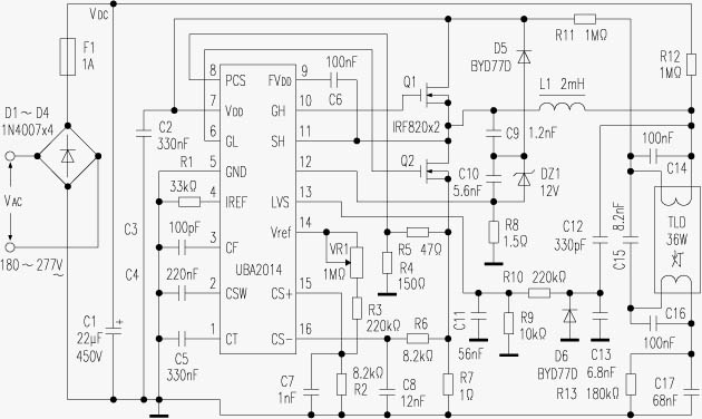 此电子镇流器的AC输入电压允许达277V,适当调节电感元件(L1)的参数,可配接20~60W的荧光灯。UBA2014由飞利浦公司推出。