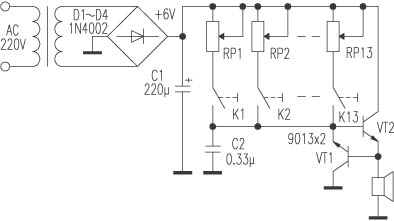 电路见附图,该电子琴的振荡器部分用了两只同型号三极管VT1和VT2,相当于两个串联的开关。当VT1、VT2截止时,电容C2充电;当VT1、VT2导通时,C2经VT1、VT2放电。附图中的13只可调电阻RP1~RP13是电子琴的音阶电阻,同时也是振荡器的定时电阻。K1~K13是琴键开关。接通电源,当琴键按下时,+6V直流电压经音阶电阻RP1~RP13和琴键K1~K13向电容C2充电,C2很快被充满,这使VT2的基极为高电平,故VT2饱和导通(相当于第一只开关接通)。此时电流流过扬声器,在扬声器两端产生较大的电压降,这又使VT1的基极为高电平,故VT1也随之饱和导通(相当于第二只开关接通),C2所充的电经VT1的c、e极迅速放电。C2放完电后,其残存电压很低(VT1的c、e极饱和压降,为零点几伏),不足以维持VT1和VT2导通,因两管导通需C2提供约1.4V电压(两发射极压降之和),故VT1和VT2两只“开关”全部关断。此后,电源再次经RP1~RP13和K1~K13向C2充电,当C2充满电后,电路再次重复上述过程,从而产生音频振荡,振荡信号推动扬声器发出音乐声。调试时依次按下K1~K13,然后调节RP1~RP13的值,使扬声器依次发出5、6、7……1、2、3的音阶声即可。 1、 本站不保证以上观点正确,就算是本站原创作品,本站也不保证内容正确。 2、如果您拥有本文版权,并且不想在本站转载,请书面通知本站立即删除并且向您公开道歉! |