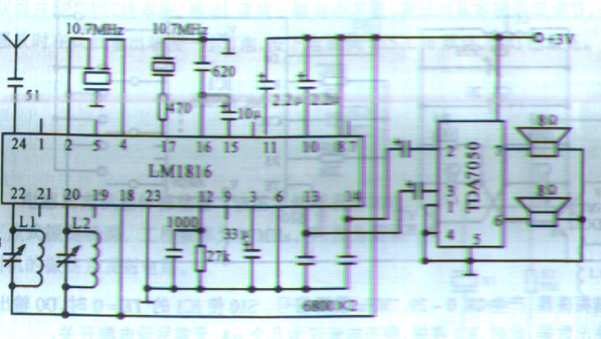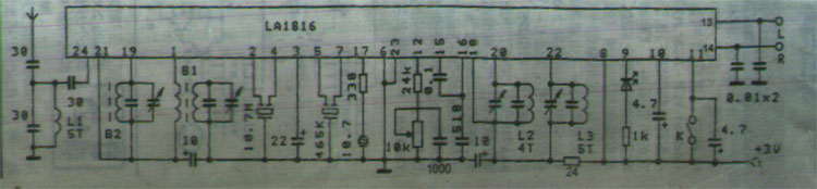 | 选择分类:当前分类——实用电路 相关联或者相类似的文章: 信号发生与频率测量09年技能大赛(1783) 数字电路循迹小车(1783) 十字旋转LED点阵套件制作说明(1783) 直流电机控制电路专辑(1783) 水位控制电路(898) 几种微型电机驱动电路实验和分析(884) 电话线路防盗报警器(865) 光电耦合器的应用(864) 节能型摩托车整流稳压器(860) 给彩电加装无线伴音发射装置(852) 电子灭蝇器(847) 利用TL431作大功率可调稳压电源(805) 电话转呼器(801) 论电视机代替万用表、示波器的可行性(794) 红外接收头的构造(770) 40kHZ超声波收发电路集锦(756) LM567集成电路的应用 (749) 金属接近开关(746) 单运放构成的单稳延时电路(744) 超声波测距精度的探讨(742) 首页 前页 后页 尾页 本站推荐: | LA1816的应用 LA1816是目前较新型的单片立体声收音电路,它为24脚双列直插封装和双列扁评封装,其电参数一致。它内含AM/FM朝外差接收功能和立体声解码功能,只需少量的外围元件和外接功放即可收听调频立体声节目。下图是LA1816的原理图 B1是AM磁性天线,B2为AM振荡线圈。L2、L3分别为FM高放和振荡线圈,转换K可AM/FM选听的节目,当收听立体声节目时,第9脚为低电平,LED发光指示,调节12脚可变电阻可使左右声道达到平衡。从天线接收到的电台信号经过IC内的高放变频中放检波立体解码处理后,从13、14脚输出立体声音频信号,外接音频功放即可收听。 本IC的电压为1。8--6V,3V时AM静态电流为3MA,FM为8MA,接收灵敏度分别为AM/1MV/M和FM/20UV/M,由于它的灵敏度和选择性都比较好,所以使用小天线即可正常收听。
