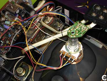 Once the switch is wired up, you can now connect the audio input. The audio jack we used is a mono 1/4" type. You then connect the positive and negative lines on the jack to the two horizontal inputs on the tube. Normally the way you connect the audio jack to the tv tube does not matter, however, in some cases, it does matter. When that happens, the tv will display nothing, or very little, so, just switch the way the wires are connected to the tube.