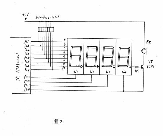 | 选择分类:当前分类——学单片机 相关联或者相类似的文章: 赠品说明以及免费大放送(1271) 用单片机控制字符型液晶显示模块(1249) 电子基础知识--电感(1239) 发光二极管的几种特殊用法(1236) 国产OS?中文CPU?(1213) 是否已经欺骗你的眼睛?(1213) 部分万用表电路图集(1197) MY8848网站销声匿迹 消费者(1196) 充满电磁波的天空 (1194) 请广大朋友千万不要信封寄钱!(1193) 有地下王国吗?(1182) 用AT89C2051设计超声波测距仪(1171) 小小电子闹钟 生活学习良伴(1165) 厨房定时器(1160) 求职技巧:求职必成6原则(1154) 印制电路板的可靠性设计(1154) 李鬼网站换个网址继续行骗(1151) 面试的多方位攻略(1146) 一只小狗的职场启发(1142) 网站在线管理系统(1141) 首页 前页 后页 尾页 本站推荐: | 小小电子闹钟 生活学习良伴 小小电子闹钟 生活学习良伴 ——— 一款电路极简的单片机电子钟设计详解 电路特点 这里介绍的电子钟,电路可称得上极简,它仅使用单片的20引脚单片机完成电子钟的全部功能,而笔者见到的其它设计方案均采用二片以上的多片IC实现。 电路见图1。 ![]() 一片20引脚的单片机AT89C2051为电子钟主体,其显示数据从P1口分时输出,P3.0~3.3则输出对应的位选通信号。由于LED数码管点亮时耗电较大,故使用了四只PNP型晶体管VT1~VT4进行放大。本来笔者还有一种更简的设计方案(见图2),可省去VT1~VT4及R1~R4八个元件,但这种设计由于单片机输出口的灌入电流有限(约20mA),数码管亮度较暗而不向读者介绍,除非你采用了高亮度的发光数码管。 ![]() P3.4、P3.5、3.7外接了三个轻触式按键,这里我们分别命名为:模式设定键set(P3.4)、时调整键hour(P3.5)、分调整键min(P3.7)。C1、R13组成上电复位电路。VT5及蜂鸣器Bz为闹时讯响电路。三端稳压器7805输出的5V电压供整个系统工作。此电子钟可与任何9~20V/100mA的交直流电源适配器配合工作,适应性强。 电子钟功能 1.走时:通过模式设定键set选择为走时,U1、U2显示小时,U3、U4显示分。U2的小数点为秒点,每秒闪烁一次。 2.走时调整:通过模式设定键set选择为走时调整,按下hour键对U1、U2的走时“时”显示进行调整(每0.2秒递加1)。按下min键对U3、U4的走时“分”显示进行调整(每0.2秒递加1)。 3.闹时调整:通过模式设定键set选择为闹时调整,按下hour键对U1、U2的闹时“时”显示进行调整(每0.2秒递加1)。按下min键对U3、U4的闹时“分”显示进行调整(每0.2秒递加1)。 4.闹时启/停设定:通过模式设定键set选择为闹时启/停设定,按下min键U3的小数点点亮,闹时功能启动;按下hour键U3的小数点熄灭,闹时功能关停。 由于电路设计得极其简单,因此丰富的功能只能由软件完成,这里软件设计成为了关键。下面介绍软件设计要点。 图3为主程序状态流程。 ![]() 图3 运行时建立的主要状态标志如下: flag—掉电标志。掉电后,flag内为一随机数;重新设定时间后flag内写入标志数55H。 set—工作模式设定标志。 hour—走时“时”单元。 min—走时“分”单元。 sec—走时“秒”单元。 deda—走时5mS计数单元 t_hour—闹时“时”单元。 t_min—闹时“分”单元。 d_05s—0.5秒位标志。每秒钟的前0.5秒置1,后0.5秒置0,以使秒点闪烁。 o_f—闹时启/停位标志。闹时启动置1,闹时关停置0。 另外将定时器T0设定为5mS的定时中断。这里晶振频率为12MHz,因此5mS的初值为-5000,但实际上程序还要作其它运算,使得时间偏长,经调整为-4800后试验刚好。计时单元deda每次中断均加1。走时函数判断deda>=200时即令秒单元sec加1。同理秒单元sec满60后令分单元min加1。分单元min满60后令时单元hour加1。时单元hour满24后清0。 上电后,首先进行初始化,对各状态标志、输入输出口及定时器T0进行初始化工作,以适应后面程序的要求。 随后程序判断有无set键按下,如按下,则set键值从0起加1。set键值只能从0加到3,然后又回到0。 接下来,根据键值进行散转。若set=0,运行走时程序;若set=1,进入调整闹时时间程序;若set=2,进入调整走时时间程序;若set=3,显示已调好的闹时时间,同时进入启/停闹时程序。 散转完后,进行判断掉电标志flag是否等于55H。若不等,说明刚开机上电或运行过程中掉过电,这时四个数码管以1Hz的频率闪烁四个8字,提示时间不准;若相等,说明未掉电,RAM区内容未变化,时间准确。 再下来程序又转回到初始化之后进行循环运行。 由于使用了四只数码管密集排列,因此只能采用双面印刷板设计,图4、5分别为正面(元件面)、反面的印板图。尺寸3000milx4000mil(7.62cmx10.16cm)。图6为计算机输出的三维仿真印制板。 ![]() 图4 ![]() 图5 ![]() 图6 元件选用 为了走时准确,晶振X最好选用温漂小的。四个数码管U1~U4可选用发绿光的,这样光泽较柔和。蜂鸣器Bz要购买绕线型的电动式蜂鸣器(市场上有一种加电压即工作的蜂鸣器这里不适用),因驱动信号为脉冲信号。其它元件一般无特殊要求。 使用方法 上电后,四个LED数码管闪烁四个8字。 按一下set键,闪烁现象消失(此时set=1),U1的小数点亮,说明此刻可以调整闹时时间。按下hour键,U1、U2作加法;按下min键,U3、U4作加法。这些调整好的数据被同时送入RAM区的闹时记忆“时”单元t_hour和闹时记忆“分”单元t_min。 再按一下set键,set=2,U2的小数点亮,此刻可以调整走时时间。按下hour键,U1、U2作加法;按下min键,U3、U4作加法。这些调整好的数据也被同步送入RAM区的“时”记忆单元hour和“分”记忆单元min。 再按一下set键,