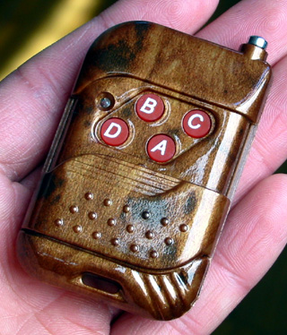 图为发射器外形,面板上有A、B、C、D四位操纵按键及一个发射指示灯。发射机内部采用进口声表谐振器稳频,频率一致性非常好,稳定度极高,工作频率315MHZ频率稳定度优于10-5,使用中无需调整频点,特别适合多发一收等无线电遥控系统使用,而目前市场上的一些低价位无线电遥控模块一般仍采用LC振荡器,稳定度及一致性较差,即使采用高品质微调电容,当温度变化或者震动后也很难保证已调试好的频点不会发生偏移,造成发射距离缩短。