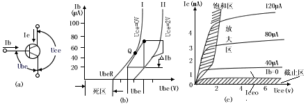 图2 (b)是三极管的输入特性曲线,它表示Ib随Ube的变化关系,其特点是:1)当Uce在0-2伏范围内,曲线位置和形状与Uce 有关,但当Uce高于2伏后,曲线Uce基本无关通常输入特性由两条曲线(Ⅰ和Ⅱ)表示即可。