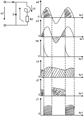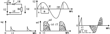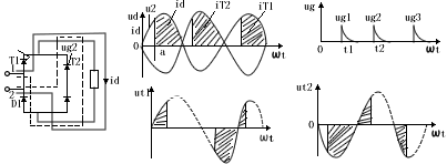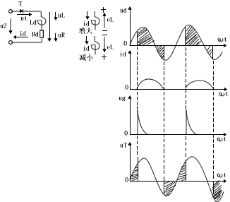 3)当电源电压u2下降及u2≥0时,只要释放磁场能量可以维持id继续流通,可控硅T仍然牌导通状态,此时ud=u2。当u2<0时,虽然ud出现负值,但电流id的方向不变。 4)当电流id减小到小于维持电流IH时,可控硅T自行关断,id=0,UT=u2,可控硅承受反压。 5)负载电压平均值: