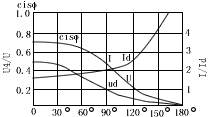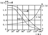 比值Ud/U,I/Id和cosψ随α的变化数值见表二,相应关系曲线见图4 表二、 Ud/U、I/Id、cosψ与α的关系表 |