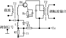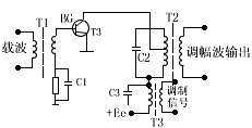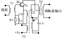 调幅电路是把调制信号和载波信号同时加在一个非线性元件上(例如晶体二极管或三极管)经非线性变换成新的频率分量,再利用谐振回路选出所需的频率成分。 调幅电路分为二极管调幅电路和晶体管基极调幅、发射极调幅及集电极调幅电路等。 通常,多采用三极管调幅电路,被调放大器如果使用小功率小信号调谐放大器,称为低电平调幅;反之,如果使用大功率大信号调谐放大器,称为高电平调幅。 在实际中,多采用高电平调幅,对它的要求是:(1)要求调制特性(调制电压与输出幅度的关系特性)的线性良好;(2)集电极效率高;(3)要求低放级电路简单。 1、基极调幅电路 图1是晶体管基极调幅电路,载波信号经过高频变压器T1加到BG的基极上,低频调制信号通过一个电感线圈L与高频载波串联,C2为高频旁路电容器,C1为低频旁路电容器,R1与R2为偏置的分压器,由于晶体管的ic=f(ube)关系曲线的非线性作用,集电极电流ic含有各种谐波分量,通过集电极调谐回路把其中调幅波选取出来,基极调幅电路的优点是要求低频调制信号功率小,因而低频放大器比较简单。其缺点是工作于欠压状态,集电极效率较低,不能充分利用直流电源的能量。 2、发射极调幅电路 图2是发射极调幅电路,其原理与基极调幅类似,因为加到基极和发射极之间的电压为1伏左右,而集电极电源电压有十几伏至几十伏,调制电压对集电极电路的影响可忽略不计,因此射极调幅与基极调幅的工作原理和特性相似。 3、集电极调幅电路 图3是集电极调幅电路,低频调制信号从集电极引入,由于它工作于过压状态下,故效率较高但调制特性的非线性失真较严重,为了改善调制特性,可在电路中引入非线性补尝措施,使输入端激励电压随集电极电源电压而变化,例如当集电极电源电压降低时,激励电压幅度随之减小,不会进入强压状态;反之,当集电极电源电压提高时,它又随之增加,不会进入欠压区,因此,调幅器始终工作在弱过压或临界状态,既可以改善调制特性,又可以有较高的效率,实现这一措施的电路称为双重集电极调幅电路。 采用图4的集电极、发射极双重调幅电路也可以改善调制特性。注意变压器的同名端,在调制信号正半波时,虽然集电极电源电压提高,但同时基极偏压也随之变正,这就防止了进入欠压工作状态;在调制信号负半波时,虽然集电极电压降低,但基极度偏压也随之变负,不致进入强过压区,从而保持在临界、弱过压状态下工作。
