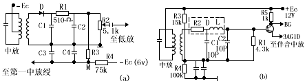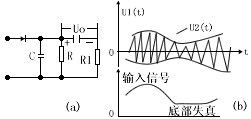另一种切割失真是由于检波器的低频交流负载与直流负载电阻不同而引起的,通常检波被输出的低频电压经耦合电路[图7(a)中的R1C1]再送至低频放大器中去由于C1数值很大,(约为10微法)它的两端降有直流电压为载波幅度的平均值Uco若R1<R时,该电压大部分落在R两端上,以致在音频包络负半波时,输入电压可能低于R两端的直流电压,于是二极管截止,输出信号不再随输入信号包络的下降而改变,产生如图7-b的底边切割失真,要避免此失真,应满足下式 m<R1/(R1+R) 式中:R为直流电阻,交流电阻R-=R//R1。不失真条件可写为m<R-/Ro、图8(a)是晶体管收音机的滤波电路,R1R2滤除464千赫载波信号的滤波器,电源-Ec经R3、R4供给二极管几十微安的偏置电流,接入偏置电流的目的是提高检波效率,M点电压经C3、C4滤波后送至前级产生自动增益控制。 图8(b)是电视接收机的滤波电路,由于调制信号为高达6兆赫的图象信号,为防止对角切割失真,电容C1只选10皮法,但只靠它滤除载波还不够,还要接入LC2滤波器,二极管串接小电阻200欧使信号增大,补偿二极管内阻的减小,从而使传输系数相对稳事实上,检波线性也得到改善。