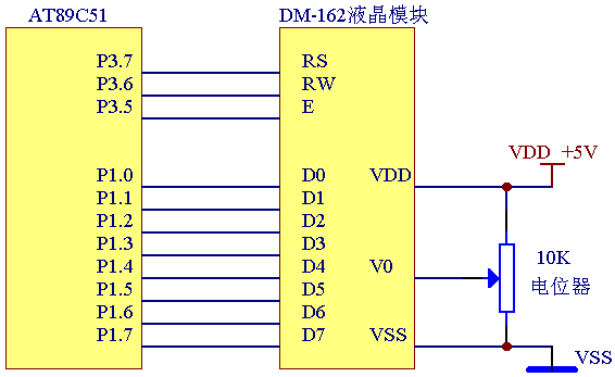 它的读写操作、屏幕和光标的操作都是通过指令编程来实现的。(说明:1为高电平、0为低电平) 指令1:清显示,指令码01H,光标复位到地址00H位置 指令2:光标复位,光标返回到地址00H 指令3:光标和显示模式设置 I/D:光标移动方向,高电平右移,低电平左移 S:屏幕上所有文字是否左移或者右移。高电平表示有效,低电平则无效 指令4:显示开关控制。 D:控制整体显示的开与关,高电平表示开显示,低电平表示关显示 C:控制光标的开与关,高电平表示有光标,低电平表示无光标 B:控制光标是否闪烁,高电平闪烁,低电平不闪烁 指令5:光标或显示移位 S/C:高电平时移动显示的文字,低电平时移动光标 指令6:功能设置命令 DL:高电平时为4位总线,低电平时为8位总线 N:低电平时为单行显示,高电平时双行显示 F: 低电平时显示5x7的点阵字符,高电平时显示5x10的点阵字符 指令7:字符发生器RAM地址设置 指令8:DDRAM地址设置 指令9:读忙信号和光标地址 BF:为忙标志位,高电平表示忙,此时模块不能接收命令或者数据,如果为低电平表示不忙。 指令10:写数据 指令11:读数据 DM-162液晶显示模块可以和单片机AT89C51直接接口,电路如图1所示。