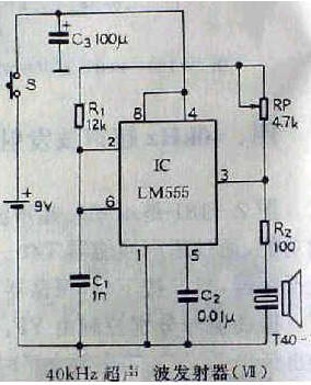 40kHZ超声波发射电路之五,由LM555时基电路及外围元件构成40kHZ多谐振荡器电路,调节电阻器RP阻值,可以改变振荡频率。由LM555第3脚输出端驱动超声波换能器T40-16,使之发射出超声波信号。电路简单易制。电路工作电压9V,工作电流40~50mA。发射超声波信号大于8m。LM555可用NE555直接替代,效果一样。