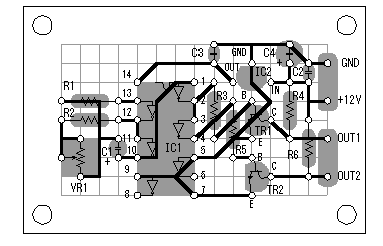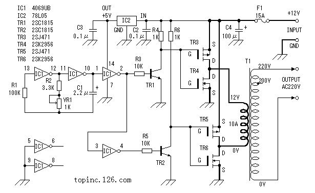 由于方波信号发生器输出的振荡信号电压最大振幅为0~5V,为充分驱动电源开关电路,这里用TR1、TR2将振荡信号电压放大至0~12V。如图4所示。