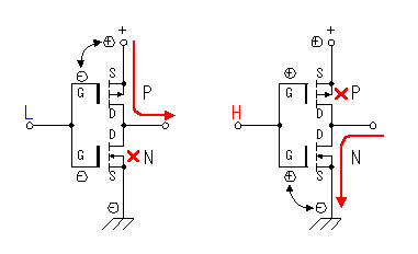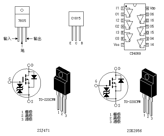 下面简述一下用C-MOS场效应管(增强型MOS 场效应管)组成的应用电路的工作过程(见图9)。电路将一个增强型P沟道MOS场效应管和一个增强型N沟道MOS场效应管组合在一起使用。当输入端为低电平时,P沟道MOS场效应管导通,输出端与电源正极接通。当输入端为高电平时,N沟道MOS场效应管导通,输出端与电源地接通。在该电路中,P沟道MOS场效应管和N沟道MOS场效应管总是在相反的状态下工作,其相位输入端和输出端相反。通过这种工作方式我们可以获得较大的电流输出。同时由于漏电流的影响,使得栅压在还没有到0V,通常在栅极电压小于1到2V时,MOS场效应管既被关断。不同场效应管其关断电压略有不同。也正因为如此,使得该电路不会因为两管同时导通而造成电源短路。