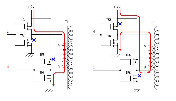 由以上分析我们可以画出原理图中MOS场效应管电路部分的工作过程(见图10)。工作原理同前所述。这种低电压、大电流、频率为50Hz的交变信号通过变压器的低压绕组时,会在变压器的高压侧感应出高压交流电压,完成直流到交流的转换。这里需要注意的是,在某些情况下,如振荡部分停止工作时,变压器的低压侧有时会有很大的电流通过,所以该电路的保险丝不能省略或短接。