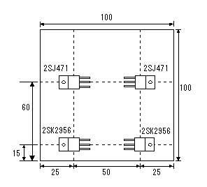电路板见图11。所用元器件可参考图12。逆变器用的变压器采用次级为12V、电流为10A、初级电压为220V的成品电源变压器。P沟道MOS场效应管(2SJ471)最大漏极电流为30A,在场效应管导通时,漏-源极间电阻为25毫欧。此时如果通过10A电流时会有2.5W的功率消耗。N沟道MOS场效应管(2SK2956)最大漏极电流为50A,场效应管导通时,漏-源极间电阻为7毫欧,此时如果通过10A电流时消耗的功率为0.7W。由此我们也可知在同样的工作电流情况下,2SJ471的发热量约为2SK2956的4倍。所以在考虑散热器时应注意这点。图13展示本文介绍的逆变器场效应管在散热器(100mm×100mm×17mm)上的位置分布和接法。尽管场效应管工作于开关状态时发热量不会很大,出于安全考虑这里选用的散热器稍偏大。
