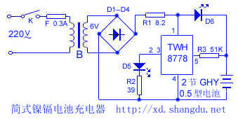接通开关K,220伏交流市电经变压器B变压,D1-D4整流后,通过R1、D6给2节GNY0.5型电池(5号镍镉电池)以500mA的电流进行充电。D6发光指示正在充电,此时,TWH8778开关集成电路控制极⑤脚开启电压小于1.6V,电路不能导通,因此D5不亮。随着充电的继续进行。GNY电池充电电流逐渐减小,电池端电压逐渐升高,TWH8778的控制极⑤脚电压也逐渐升高,当等于1.6V时,电路导通,D5发光,指示电池已充足电。 1、 本站不保证以上观点正确,就算是本站原创作品,本站也不保证内容正确。 2、如果您拥有本文版权,并且不想在本站转载,请书面通知本站立即删除并且向您公开道歉! |
