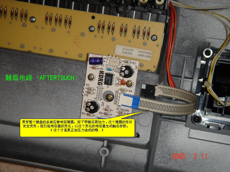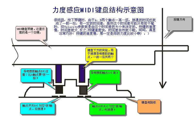| 选择分类:当前分类——电子制作 相关联或者相类似的文章: 怎样安装AT51编程板的USB转串口软件?(8206) 装在火柴盒里的悄悄听别人讲话的发射器(1999) 红外感应电子狗制作详解(1560) 台灯触摸开关(1560) ++ 带限流保护的可调稳压电源 (1331) 分立电子开关、OTL功放详解(1274) 用单片机控制字符型液晶显示模块(1249) 厨房定时器(1160) 电子制作专用微型模块盒子(1132) 性能可靠的60W石英灯用电子变压器(1091) 做梦机的制作(1078) 自己动手制作无线话筒(944) MA21小型电子调速器的制作(939) 500米无外壳四通道遥控模块(926) 关于“D40”最早的文章(907) 用三端稳压LM317制作的甲类功放(898) ++ 汽车电池电压监视器 ++(897) 电子小鸡(896) 简单实用的遥控开关(895) 简易电话机测试装置(889) 首页 前页 后页 尾页 本站推荐: | 电子琴的力度是怎样实现的 相信用MIDI制作音乐的朋友,最熟悉的MIDI参数就是Velocity(力度)了,这不仅是最常用的,而且是大部分音序软件的KEY编辑窗口缺省显示的。不过,大家是否注意到:“Velocity”这个单词在英文中的意思并不是“力度”,而是“速度、速率”。跟音乐有关的力度术语,英文名应该是“Dynamic”! 这是为什么呢?难道MIDI标准制定的时候,专家们搞错了吗?........... 呵呵~当然不是,这是因为,MIDI就是用“速度”来模拟“力度”的! 大家知道,最常用的MIDI输入设备就是MIDI键盘,包括专门的MIDI键盘以及合成器、电子琴、电钢琴等等,这些键盘是如何来产生力度参数的呢? 简单给大家分析一下。 一般MIDI键盘产生MIDI音符的过程是这样的:按下键盘、利用键盘下方的导电橡胶和电路的接通,实现“键导通”信息,然后触发音源发声或者进入音序器录音。 下面来看一下导电橡胶的样子:注意,每一个琴键都对应两个触点开关,嗯?为什么一个琴键需要两个“开关”呢,玄机就在这里哦。 (这张照片照得不清晰,菜啊~~) ![]() 下面这张照片,是键盘底部的结构,也就是键盘下面倒过来看的样子......, 露出键盘的地方,上面的电路板已经拆掉了。 接下来这张:是拆下来这块键盘电路板的照片,大家根据图上的注解,理解琴键按下后,电路是如何接通的。 ![]() 不知道大家看明白没有,水平有限,只能说这些啦~:) ![]() 最后,再顺便说说Aftertouch(触后)参数,这在MIDI键盘上是另一种独立电路产生的,请看图: ![]() 全文完~~欢迎讨论、指正! 1、 本站不保证以上观点正确,就算是本站原创作品,本站也不保证内容正确。 2、如果您拥有本文版权,并且不想在本站转载,请书面通知本站立即删除并且向您公开道歉! |