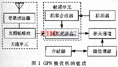 利用GPS卫星实现导航定位时,用户接收机的主要任务是提取卫星信号中的伪随机噪声码和数据码,以进一步解算得到接收机载体的位置、速度和时间(PVT)等导航信息。因此,GPS接收机是至关重要的用户设备。目前实际应用的GPS接收机电路一般由天线单元、射频单元、通信单元和解算单元等四部分组成,如图1所示。本文在分析GPS卫星信号组成的基础上,给出了射频前端GP2010的原理及应用。