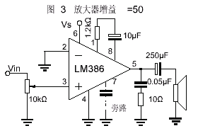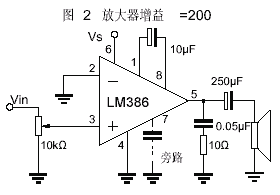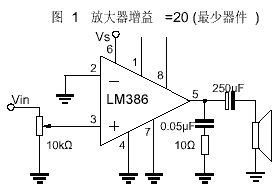 | 选择分类:当前分类——常用资料 相关联或者相类似的文章: 传感器调制器控制器(724) LED数字显示驱动集在电路。(716) 设置使用无线电台各种表格(714) 康铜、锰铜、镍铬合金线规格表(713) 超力通手机旅行充电器 (712) 科技的变革——电子图书馆(710) 调频广播接收芯片TEA5767的应用(707) ZC-2-10A自动充电机(705) 74HC595 的实际应用与编程 (701) 4.CMOS-NMOS集成电路的接口(701) 实验板驱动步进电机(697) 手机电路图中英文对照(续)(697) 12V铅酸蓄电池充电电路(694) DC-12V/AC-220V逆变电路 (694) 基础知识 之 实用电子电路入门(686) 78系列稳压IC的管脚判断法(684) 单片机资料:C2051/C51的详细资料(682) 简易家用逆变电源 (671) 常用发射三级管资料大全 (668) 超微型贴片FM发射片(无线高灵敏度监听)(667) 首页 前页 后页 尾页 本站推荐: | LM386 低电压音频功率放大器 LM386 低电压音频功率放大器 --------------------------------------------------------------------------- 一、概述(Description): LM386是美国国家半导体公司生产的音频功率放大 器,主要应用于低电压消费类产品。为使外围元件最少,电压增益内置为20。但在1脚和8脚之间增加一只外接电阻和电容,便可将电压增益调为任意值,直至 200。输入端以地位参考,同时输出端被自动偏置到电源电压的一半,在6V电源电压下,它的静态功耗仅为24mW,使得LM386特别适用于电池供电的场 合。