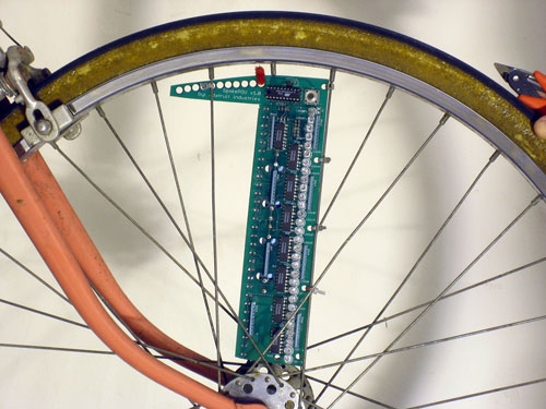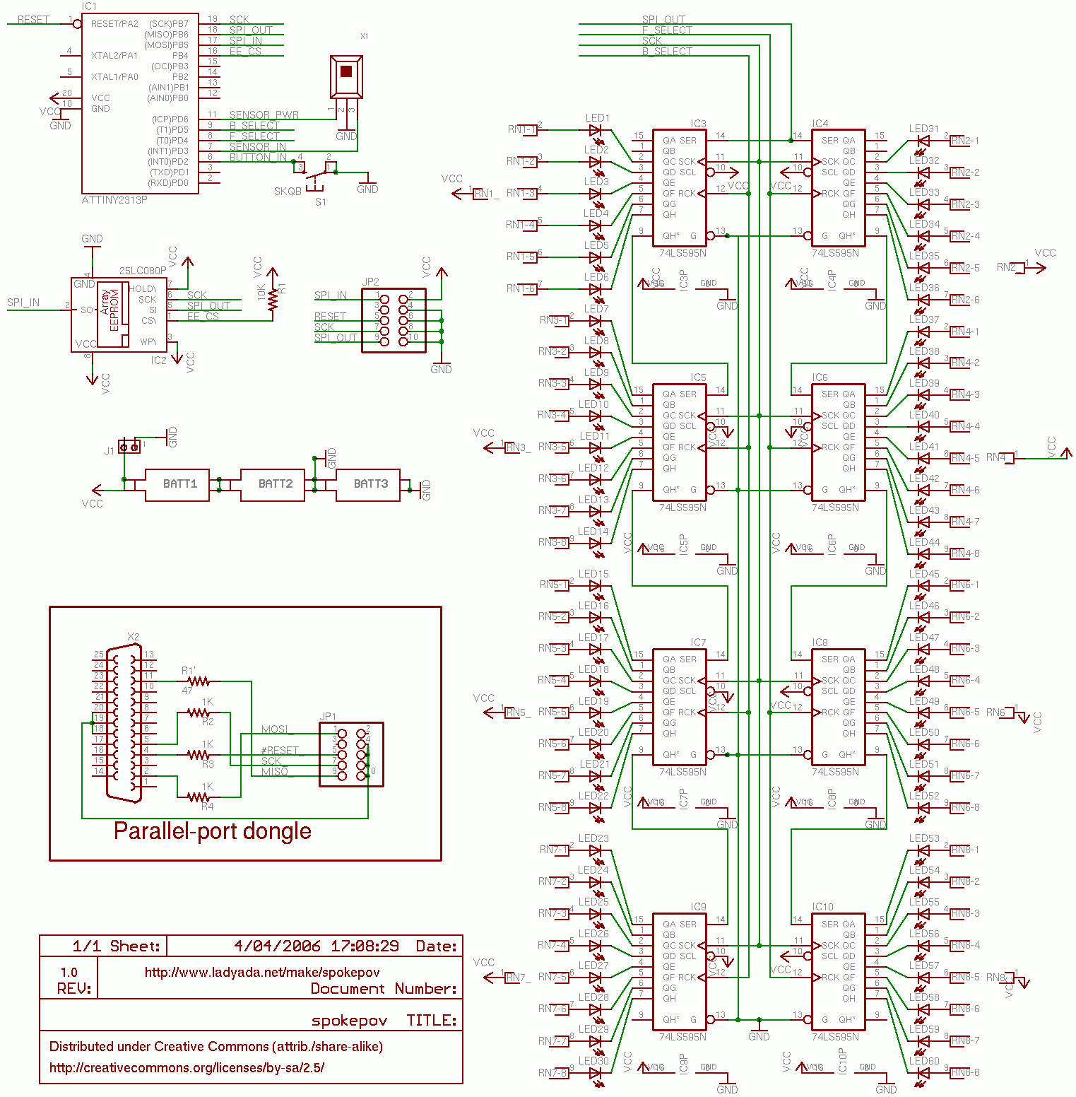 | 选择分类:当前分类——学单片机 相关联或者相类似的文章: CMOS集成电路应用常识(543) 直流输入如何得到220V/1-2W的交流电(543) 法传销组织的“洗脑”骗术三(542) 电子技术自立学习法(541) 一款最简单的手机/MP3充电器电路图(541) 可充电电池技术和充电方法(540) SC3610频率及时钟显示驱动电路(540) 写给伟大教师的一封信:(539) STC单片机简介(539) 什么是卫星电视广播,它由几部分组(539) 多间单房长年低价招租(538) 固态继电器的选型注意事项(538) 存储器名词解释 (538) 专访中国农民制造超轻型飞机第一人——刘亦兵 (538) 常用三极管资料查询2(537) 常用三极管资料查询1(537) 【图文】科学家找到揭开地球最初奥(536) 摩托罗拉168VA手机汽车充电器剖析 (536) ★单片双路四位计数器程序(536) 简易漏电报警器(535) 首页 前页 后页 尾页 本站推荐: | 在转动车轮上显示图案(AVR做的风火轮) SpokePOV - 在转动的自行车轮子上显示图案(国外用AVR的小制作) Spoke POV是个美国人开发的小玩意。由电池,8bit AVR单片机,EEPROM,串并转换芯片,霍尔元件和一堆LED组成。整块板子固定在自行车的辐条上。使用已经开发好的软件把BMP图案写入 EEPROM。骑车的时候霍尔元件配合自行车固定部分上的磁铁来检测位置,LED按照特定顺序点亮,就可以显示图案了。 相关连接:http://www.ladyada.net/make/spokepov/index.html 效果图 ![]() ![]() ![]() ![]() ![]() ![]() 原理图: 1、 本站不保证以上观点正确,就算是本站原创作品,本站也不保证内容正确。 2、如果您拥有本文版权,并且不想在本站转载,请书面通知本站立即删除并且向您公开道歉! |