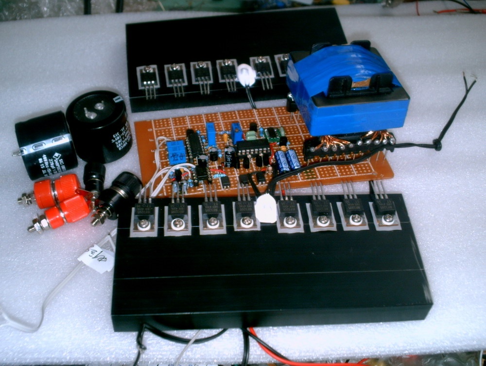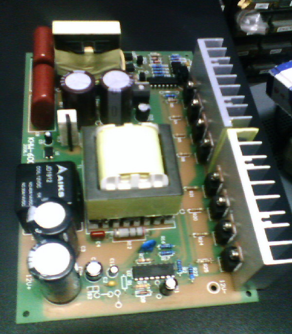 此机具有输出短路保护,输出电压超高保护(防止击穿烧坏后级功率器件),散热器热风扇自动启动,散热器冷风扇自动停,MOS管温度超高自动停止输出保护,电池电量低欠电压报警。本来想在前级加防反接措施,但是没有买到合适的保险丝或继电器。不知那位高手有没有除保险丝和继电器之外的可靠的防反接方法,我想请教请教!谢谢!