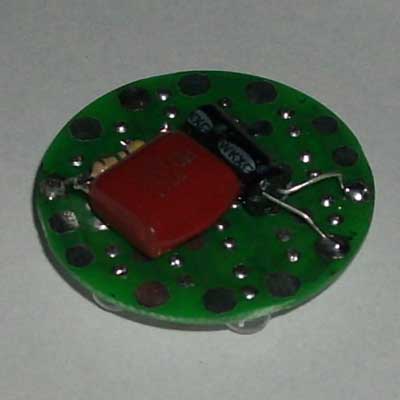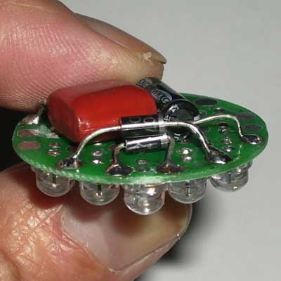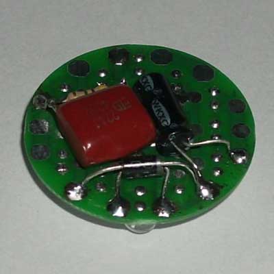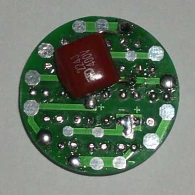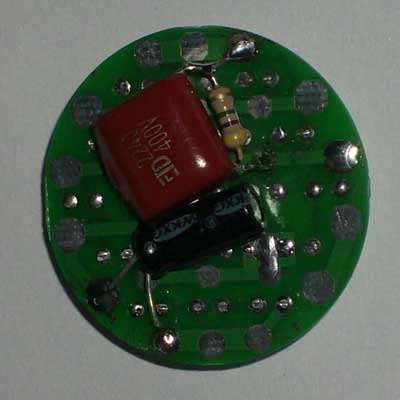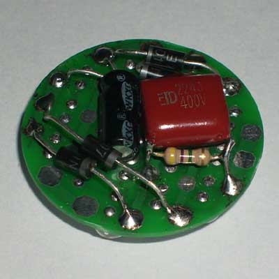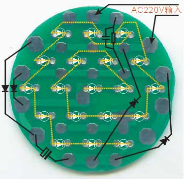 套件说明,罗口的电镀玻璃反光灯杯1只、圆型透明的平面封口玻璃1块、0.8mm高精度双面电路板1块、高亮白光草帽灯19只、400V224高压金属膜限流电容1只、1N4007整流二极管4只、4.7M高压泄流电阻1只、63V10UF消闪烁用滤波电容1只。 制作装配时需要电烙铁、万用表、尖嘴钳、剪钳、热熔胶枪(胶)等工具消耗品请自备。市面上相同功能和特性的LED灯售价高达18元以上,更有高达百元以上的LED灯,现在大家自己动手,只需要十多元就可以立即享用这世界上最新的环保省电LED照明技术!学校组织批量购买,每50套赠送一套备品,免费提供部分元件备品! 电路原理图:工作原理非常简单,通过电容限流了发光二极管的工作电流小于25MA,加上C2吸收了开关灯的冲击电流,有效的确保了发光二极管的使用寿命。采用电容降压,不消耗电能,不发热,效果好。(发光二极管的工作电流由C1的容量决定,如图最大不能超过474,如果发光二极管的工作电流超过了50MA,估计发光二极管的寿命会大大缩短!如果觉采用224亮度已经太亮,可以换容量为104的电容,这样LED的工作寿命会超过几万小时。)