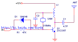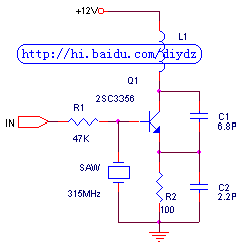 早期的发射机较多使用LC振荡器,频率漂移较为严重。声表器件的出现解决了这一问题,其频率稳定性与晶振大体相同,而其基频可达几百兆甚至上千兆赫兹。无需倍频,与晶振相比电路极其简单。以下两个电路为常见的发射机电路,由于使用了声表器件,电路工作非常稳定,即使手抓天线、声表或电路其他部位,发射频率均不会漂移。和图一相比,图二的发射功率更大一些。可达200米以上。
