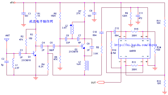 接收机可使用超再生电路或超外差电路,超再生电路成本低,功耗小可达100uA左右,调整良好的超再生电路灵敏度和一级高放、一级振荡、一级混频以及两级中放的超外差接收机差不多。然而,超再生电路的工作稳定性比较差,选择性差,从而降低了抗干扰能力。下图为典型的超再生接收电路。