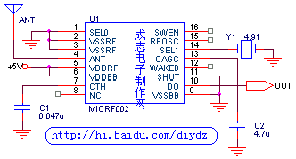 超外差电路的灵敏度和选择性都可以做得很好,美国Micrel公司推出的单片集成电路可完成接收及解调,其MICRF002为MICRF001的改进型,与MICRF001相比,功耗更低,并具有电源关断控制端。MICRF002性能稳定,使用非常简单。与超再生产电路相比,缺点是成本偏高(RMB35元)。下面为其管脚排列及推荐电路。