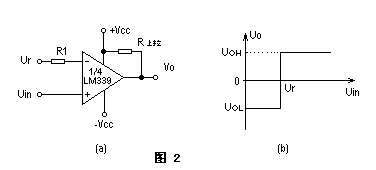 图2a给出了一个基本单限比较器。输入信号Uin,即待比较电压,它加到同相输入端,在反相输入端接一个参考电压(门限电平)Ur。当输入电压Uin>Ur时,输出为高电平UOH。图2b为其传输特性。