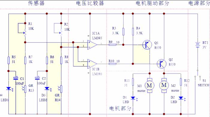 此电路应用到主要元器件: 2、带减速齿轮的直流电机 : 直流电机驱动小车的话必须要减速,否则转速过高的话小车跑得太快根本也来不及控制,而且未经减速的话转矩太小甚至跑不起来,我们专门定做的这种电机已经集成了减速齿轮大大降低了制作难度非常适合我们使用。 3、光敏电阻,它能够检测外界光线的强弱,外界光线越强光敏电阻的阻值越小,外界光线越弱阻值越大,当红色LED光投射到白色区域和黑色跑道时因为反光率的不同,光敏电阻的阻值会发生明显区别,便于后续电路进行控制。 电路原理图如:/pic/1103/xsjc06b.jpg 1、 本站不保证以上观点正确,就算是本站原创作品,本站也不保证内容正确。 2、如果您拥有本文版权,并且不想在本站转载,请书面通知本站立即删除并且向您公开道歉! |