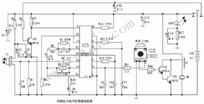 本电路中主要采用的是型号为BISS0001的集成电路。BISS0001是一款高性能的传感信号处理集成电路。静态电流极小,配以热释电红外传感器和少量外围元器件即可构成被动式的热释电红外传感报警器。广泛用于安防、自控等领域能。