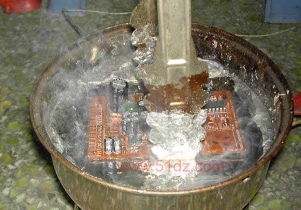 | 选择分类:当前分类——电子入门 相关联或者相类似的文章: 免费抄版软件——文字或图片转PCB文件(31341) 节能灯套件制作说明(9999) USB充电器套件制作说明(3141) 交、直流电大揭秘---通俗理解法(2597) 常用集成电路功能列表(2086) 电子基础知识--电阻篇(1748) 什么是压敏电阻?(1644) 什么是电平?(1644) 什么是“压敏电阻”(1644) [原创]最新智能色环电阻识别程序(1517) 整流电路详解 (1381) 本站免费资料的网址(1329) 爱好捕鱼的朋友千万别错过!(我的电鱼机制作经历)(1322) 测电阻法(1279) 电子基础知识--电感(1239) 充满电磁波的天空 (1194) 识别色环电阻的阻值...(1141) 了解隔离变压器(1116) 电烙铁的妙用(1109) 麻烦的USB硬盘和延长线(电子知识)(1105) 首页 前页 后页 尾页 本站推荐: | 电子线路板的简易加工图片展 如果产品生产的数量较少,大型的电子厂家就不愿意为你生产加工。即使愿意为你加工,你的加工费将因为数量小变得非常非常的昂贵,甚至仅仅加工费就远远超过成品板的价值。 但是,有时又需要生产几十、几百块板,难道你用电烙铁一个一个的焊接?那样成本也会很贵。 有没有一个低成本的方法呢?有,只要有电饭煲就可以了。请看以下组图: 先将电子元件插在电路板上并放好,注意先插小元件,注意压平元件; ![]() 插好的板一定要放在稳妥的地方,防止碰翻元件掉落; ![]() 将焊锡条放入锅中用电炉加热到全部熔化,有条件的可以安装自动温控器,也可以测量温度,温度一般在250-350度之间为宜。 如果条件都没有的话,就只有通过经验来决定了。大家可以看见图中熔化的锡象镜子一样反光,有清晰的倒影。(用干硬纸皮拨开锡面一个空间)。 ![]() 还需要松香水。松香水就是将松香放入酒精中熔解即可。酒精易挥发,注意控制浓度好象是浓茶的样子即可。浓点、淡点问题都不是很大,请根据实际经验定。 ![]() 先用金属的夹子(卖馒头面包的几块钱的就可以用,没必要买专业的)夹住板先浸一个松香水,注意松香水不要打湿电路板正面。 ![]() 再将板放进熔化的锡炉,注意不要紧张,虽然下面有三百度的高温,但你的手在十几个厘米外,非常安全的。 ![]() 先拨开锡面的锡渣,让线路板底面均匀接触锡面,此时有吱吱声和烟雾。将焊接时间控制在2到3秒左右。 ![]() 拿起线路板,看看,效果非常好,接着做下一个吧! ![]() 下图中有一块中有很大的连接,锡陀,这是焊接时间偏短或者锡炉温度低的原因。 ![]() 如果线路烫起泡,则是焊的时间偏长或者锡炉温度高。焊好的板,元件不会掉了,可以乱放。 ![]() 以上动作并不难,很简单,试一下就会了,但是,请大家注意安全,锡炉本身要放在非常稳妥的地方,注意什么东西都不要掉进锡炉(特别是浸板时要注意,防止板掉进锡炉。 声明:本站不对大家的模仿带来的任何损失负责,请小心小心再小心的操作! 参考经验: 选用口径小的锡炉,可以一次投入较少的焊锡(一般要保证有5CM左右或者更深的深度)。否则,可能第一次要放入400元以上的焊锡哟! 锡炉加热和冷却的过程分别需要30分钟到2个小时的时间之久,所以,请提前做好准备。 有条件的可以用自动温度控制器控制锡炉温度。本站有几个转让,去商城特价处理区找看还有没有。 以上图说明,用电炉也可以当作锡炉完成大量的焊接工作。欢迎转载,请常来本站。 1、 本站不保证以上观点正确,就算是本站原创作品,本站也不保证内容正确。 2、如果您拥有本文版权,并且不想在本站转载,请书面通知本站立即删除并且向您公开道歉! |