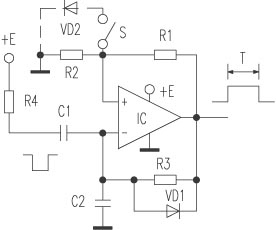 | 选择分类:当前分类——实用电路 相关联或者相类似的文章: 通过Flash学电子技术!电容篇(749) 饺子(749) LM567集成电路的应用 (749) 当前教师职业道德建设中存在的问题(749) 一般电器常用的十六种检查法(749) 电子基础知识--变压器工作原理(749) 当解剖刀划过时,尸体会不会疼?(749) 我居然遇到这样一个外贸公司!(749) 红血球的产生(748) 魂飞魄散前(748) 停尸间的歌声(748) 你一旦爱上电子技术(748) 常用场效应管及晶体管参数(747) 无线遥控门铃(747) 实用单键床头灯调光器(747) 玩与感觉统合(747) 网上赚钱宣传技巧介绍(747) 男孩子想做一位女孩子(747) 金属接近开关(746) 如何学习修理技术(745) 首页 前页 后页 尾页 本站推荐: | 单运放构成的单稳延时电路 单稳延时电路由接成电压比较器的单运放构成,电路如附图所示,有电路简单、调节延时方便等特点。 ![]() 常态时,IC输出保持低电平,这个状态是稳定的。当负脉冲经C1输入至反相端时,反相端电位低于同相端电位,输出端由低电平翻转为高电平,这个状态是不稳定的。此高电平经R1、R2分压后加至IC的同相端,使同相端电位高于反相端,从而保持高电平输出。同时,该高电平经R3和C2充电,当C2上电压被充至使反相端电位高于同相端电位时,其输出端又翻转为低电平。此时,同相端电位约为零,而C2上的电压经VD1迅速向输出端放电,使电路加速恢复到初始状态。电路稳定后反相端电位仍高于同相端电位,使输出低电平得以保持。 该电路的延时时间T不仅取决于R3、C2,而且还取决于R1、R2的分压比。所以,调节延时时间十分方便,既可调整C2、R3进行延时粗调,又可调整R2进行细调(分压比若取1/2~2/3,延时精度较高)。但是,该电路在上电时的状态是随机的,要使该电路上电后有唯一的输出状态,有两种方法:一是在电路中增加R4。这样,在上电时,由于C1上电压不能突变,电源电压经R4、C1加至反相端,即可置输出于低电平;二是在同相端与地之间接一只二极管VD2和一只开关S(如虚线所示)。上电时如输出为高电平,虽然这一状态是不稳定的,但如上所述,要经过时间T输出才为低电平,而实用上往往需要电路上电时即刻复位。为此,可在上电时先将S接通,若输出为高电平,则C2充电到0.7V即可使电路复位,大大缩短了电路上电复位的时间。复位后将S断开,电路即可正常工作。 实际应用中,若取R1为100kΩ,R2为200kΩ,则分压比为2/3,触发延时时间约为0.7R3×C2。C1可取0.1μF,R3可取10kΩ以上。IC可用单电源运放或比较器,如LM324或LM339。 成都 陈秋生 1、 本站不保证以上观点正确,就算是本站原创作品,本站也不保证内容正确。 2、如果您拥有本文版权,并且不想在本站转载,请书面通知本站立即删除并且向您公开道歉! |