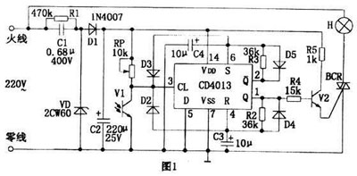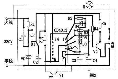 | 选择分类:当前分类——套件实验 相关联或者相类似的文章: 51单片机 Keil C 延时程序的简单研究(483) 基础知识 之 实用电子电路入门(一)(481) BA1404调频发射模块(481) 给想学单片机的同学们(480) 不要太晚睡...?(480) 论教师职业道德建设的四大机制(479) 转载收藏——如何应对AVR芯片容易被破解!(479) USB接口在串行通信中的应用(479) 315M遥控电路设计(479) C1970与C1971的区别 (478) 假网站伪造银行网站专套储户密码(478) 用BA1404制作无线话筒(477) 用AT89C2051设计的多功能密码锁 (476) ss570122的雕刻机制作过程(6)(476) 制订计划学习法(推荐)(475) 一种简单串行鼠标控制的单片机实现(475) 串联型稳压电源(475) 电视机常用名词中英文对照(下)(473) LED滚动显示屏简介(473) 有关器官捐赠的三则新闻(472) 首页 前页 后页 尾页 本站推荐: | 电子实验套件如何接6V电源 在些施工单位将建筑材料成建筑垃圾堆放在人行道上(有公安部门颁发的暂时许可证),但在晚上由于缺乏照明,很多行人为之摔跤。本文介绍的这种路障照明灯,白天不工作,夜晚自动工作,方便了行路人。 1、电路工作原理 ![]() 该照明灯电路如图1所示。C1、C2、D1、VD组成电容降压式半波整波滤电路,在C2两端得稳定的12V直流电源供电路使用。IC是一只D型触发器,与R2、C3及R3、R4、D2、D3构成一个可控自激多谐振荡器。当其触输入端CL为低电平时,由于二极管D2、D3的箝位作用,振荡器停振;当CL端为高电平时,振荡器工作,从Q端输出振荡脉冲,振荡周期T=0.7(R2C3+R3C4)。 V1是光敏三极管,白天有光照射时,V1呈低阻,其集电极电位为低,IC振荡电路不工作,Q端无振荡脉冲输出。晶体管V2不工作,双向可控硅BCR截止,灯泡H不发亮。在夜晚,V1无光线照射呈高阻,其集电极电位为高,IC振荡电路起振,Q端输出振荡脉冲,经V2放大触发BCR导通,灯泡H发出闪光。 2、元件选择与制作 ![]() IC选用双D触发器CD4013(只用其中一只触发器)。V1选用3DU2光敏三极管。V2选用9013等NPN型硅晶体管,β>100。BCR选用3A600V双向可控硅TLC336或TLC386。D2~D5选用IN4148开关二极管。H选用220V,25W或40W红色灯泡。其余元件参数如图1所示。 图2是该电路印制线路板。除V1、H外,全部元件装焊在印制板上。焊接时,要使用电烙铁有良好接地,以免损坏CD4013电路。调节R2、R3阻值,使IC振荡周期为0.5秒,即1秒钟发出2个振荡脉冲。调试时要注意印板上有市有火线,防止触电。调节RP,可调节V1灵敏度. 1、 本站不保证以上观点正确,就算是本站原创作品,本站也不保证内容正确。 2、如果您拥有本文版权,并且不想在本站转载,请书面通知本站立即删除并且向您公开道歉! |