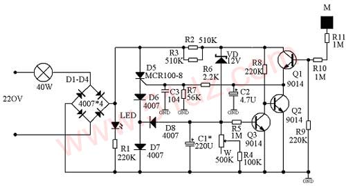 市电经过灯泡和全桥整流后一路加在单向可控硅D5上,由于一开始D5无触发控制信号,呈关断状态;另一路经R2、R3给本电路供电。初始状态下,Q1的基极为低电平截止,稳压管VD由于上端电压高于12V导通给C1充电,很快C1上就充到了电源电压,这个高电压经R5输入到Q3的基极,Q3导通,Q2截止,D5关断,灯泡熄灭。当人体触摸电路的触摸端时,人体的感应信号经R10、R11输入Q1的基极,Q1导通,电源电压通过Q1、R6,加在可控硅D5的控制极,可控硅导通,电灯点亮。由于D5的导通把本电路的电源电压拉低,稳压二极管VD不能再反向击穿导通,C1一路经W、R4放电,一路经R5维持Q3导通。在这个过程中,人体的触摸信号只需一个瞬时即可,这是因为,当人体的触发信号来时,C1上的电压很快就充到了电源电压,而这时即使人体的触发信号消失,但由于二极管D8的左边电压比右边电压高,C1只能通过W、R4进行放电,所以C1上将维持一段时间的高电平,这个高电平将维持单向可控硅导通,这就是延时的效果,灯亮后所能延时的长短取决于C1上维持高电平的时间长短,所以选择C1、W和R4的组合,可以控制延时的长短。当C1上的电压放到不能维持三极管导通时,Q3截止,Q2导通,单向可控硅的控制端没了触发信号,当交流电压过零时就被关断,灯熄灭。按上面参数,调节电位器W延时时间大约在20秒到120秒之间。