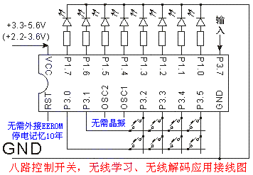 WY20D8是本站最新推出的一块用于开关控制的专用集成电路芯片。WY20D8除了具备8路开关手动控制功能,还有无线学习遥控器编码和遥控器无线控制开关的功能,学习到的编码被记忆在本芯片中,可以保证停电十年不丢失记忆的数据。完成这全部的功能,不需要外接晶振,不需要外接复位电路,不需要外接24C01存储器,全部功能一个芯片完成!请参见应用接线图的下部分。以下是功能描述: