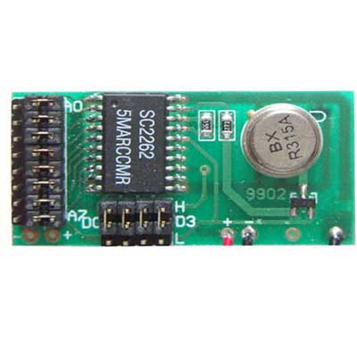 带编码无线发射模块02, 该发射模块体积小,工作电压范围极宽(3V-12V),发射功率大,功耗低,广泛应用在简易数据无线传输,无线遥控,防盗报警等场合。