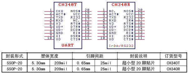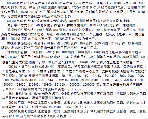 CH340 是一个USB 总线的转接芯片 SOP-20全新原装,实现USB 转串口、USB 转IrDA 红外或者USB 转打印口。 在串口方式下,CH340 提供常用的MODEM联络信号,用于为计算机扩展异步串口,或者将普通的串口设备直接升级到USB 总线。有关USB 转打印口的说明请参考手册(二)CH340DS2。 在红外方式下,CH340 外加红外收发器即可构成USB 红外线适配器,实现SIR 红外线通讯。