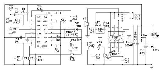 9088是一块自动扫描频率的单片收音机电路。高频广播信号经天线接收,C2、C3、C4、L1选频网络选频后从IC的11脚、12脚输入,5脚为本机振荡回路,两路信号经内部混频,从IC的8脚输出70KHz的中频信号,后经⑨脚输入到内部放大鉴频后从2脚输出音频信号。1脚为静噪控制,当接收不到信号或信号比较弱时,使2脚输出信号衰减很大,实现静噪。16脚为扫描频率控制端,当电源接通,输出控制信号加到变容二极管B910上,使其容量从高到低发生变化,使本机振荡频率从低到高发生变化,也就是接收频率从低端向高端扫描,当收到一定强度的信号即停止扫描,锁定在当前频率,此时按下K2电路继续向高频率端扫描。15脚为复位脚,当扫描到最高频率后,不能再向频率低端扫描,要跳到低端频率只能按复位按钮复位电路,再向高端扫描。