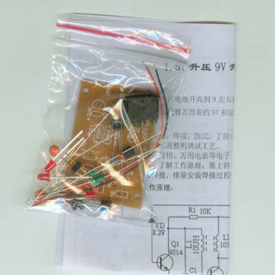 以把单节1.5V电压电池升高到9左右的电压后,驱动4个LED发光或供给其他需要高电压低电流的地方使用,例如代替万用表的9V积层电池.