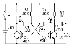 接通电源后,由于接线电阻、分布电容、元件参数的不一致等因素。三极管必然是一只导通,一只截止。当Q1导通,Q2截止时:C2经R2、Q1的基极-发射集充电,充电电流为IC2充,C1经R3、Q1集电极-发射极放电,电流为IC1放,同时电源正极经R1、Q1集电极-发射极到负极形成回路。随着C1的放电及反方向充电,当C1的右端(即Q2的基极)电位达到0.7V时,Q2由截止变为导通,其集电极电压U2=0,由于C2两端电压不能突变,Q1基极电位变为-VCC,Q1由导通变为截止,电路翻转为另一暂稳状态,当Q2导通,Q1截止时原理以其相反。当Q2截止时,LED不亮,当Q2导通时,电容C3通过Q2给D1放电,LED点亮。如此周而复始地自动翻转、闪亮。振荡周期T=0.7(R3C1+R4C2)通常选R3=R4=R,C1=C2=C。则T=1.4RC,振荡频率F=1/1.4RC