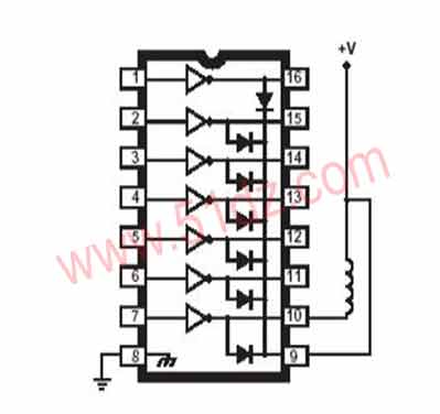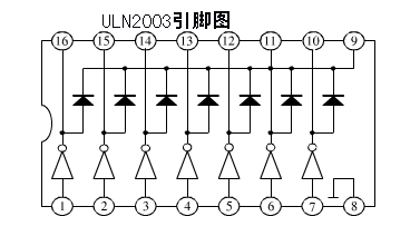 ULN2003芯片引脚介绍 引脚1:CPU脉冲输入端,端口对应一个信号输出端。 引脚2:CPU脉冲输入端。 引脚3:CPU脉冲输入端。 引脚4:CPU脉冲输入端。 引脚5:CPU脉冲输入端。 引脚6:CPU脉冲输入端。 引脚7:CPU脉冲输入端。 引脚8:接地。 引脚9:该脚是内部7个续流二极管负极的公共端,各二极管的正极分别接各达林顿管的集电极。用于感性负载时,该脚接负载电源正极,实现续流作用。如果该脚接地,实际上就是达林顿管的集电极对地接通。 引脚10:脉冲信号输出端,对应7脚信号输入端。 引脚11:脉冲信号输出端,对应6脚信号输入端。 引脚12:脉冲信号输出端,对应5脚信号输入端。 引脚13:脉冲信号输出端,对应4脚信号输入端。 引脚14:脉冲信号输出端,对应3脚信号输入端。 引脚15:脉冲信号输出端,对应2脚信号输入端。 引脚16:脉冲信号输出端,对应1脚信号输入端。