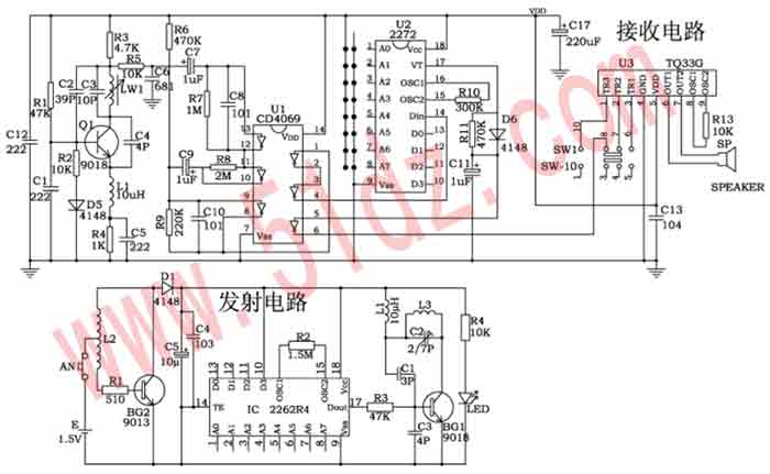 二、工作原理: 1、发射电路:按AN,BG2、L2、R1组成的升压电路把1.5V直流电转换成交流电并升压,D1整流,C5、C4滤波为发射电路提供电源。IC ⒄脚输出一串数字编码信号通过BG1放大后,由L1对外辐射。LED为信号发射指示。 2、接收电路:以Q1为核心的接收电路把电感L1上的无线电信号放大,从集电极输出一脉冲电压,通过C7进入U1放大、整形,U2解码后由⒄脚输入高电平,U1反相由⑥脚输出低电平,触发U3音乐门铃电路,使喇叭发出优美的音乐门铃声。拨动SW1可选择3种不同的音乐声。整机由2节5号电池供电,确保组装安全,本电路采用低功耗设计,确保电池能长时间使用。