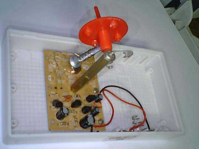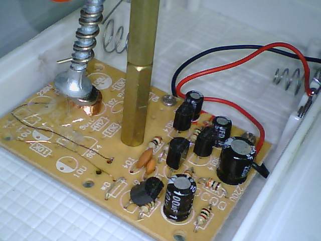 再水平放置电路板,必要时在电路板四角贴上四个2mm高的脚,让电路水平不要摇动,然后将电磁线圈固定在磁铁的正下方,这时,用手拨动磁铁支架,可以自由的转动做阻尼运动,这时,电路部分和机械部分都组装完毕。