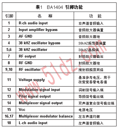 BA1404的引脚功能如图表1所示,图1为BA1404结构功能框图。它主要由前置音频放大器(AMP),立体声调制器(MPX),FM调制器及射频放大器组成。 立体声前置级分别为两个声道的音频放大器。输入为0.5mV时,增益高达37dB,频带宽度为19kHz。如输入信号中存在频率高于19kHz的成分,则必须在输入端加一个低通滤波器,否则两个声道的分离度会下降。 在立体声调制组,振荡器输出的38kHz信号于立体声调制。通常在16、17脚接一可调电阻,以获得最佳的通道分离度。 立体声混合信号(MPX输出信号)与导频输出信号(PILOT OUT)合成后的调制信号通过12脚进入射频振荡器并对载波进行FM调制,经射频放大后输出射频信号,射频信号的典型值在600mV左右。 BA1404内部还提供了一个参考电压单元VREF。设计者可以利用这个电压信号改变外接变容二极管的电容值,继而改变载波的振荡频率。因此,只要控制一个电阻的分压值就可以达到改变发射频率的目的,这是比较独特的设计。