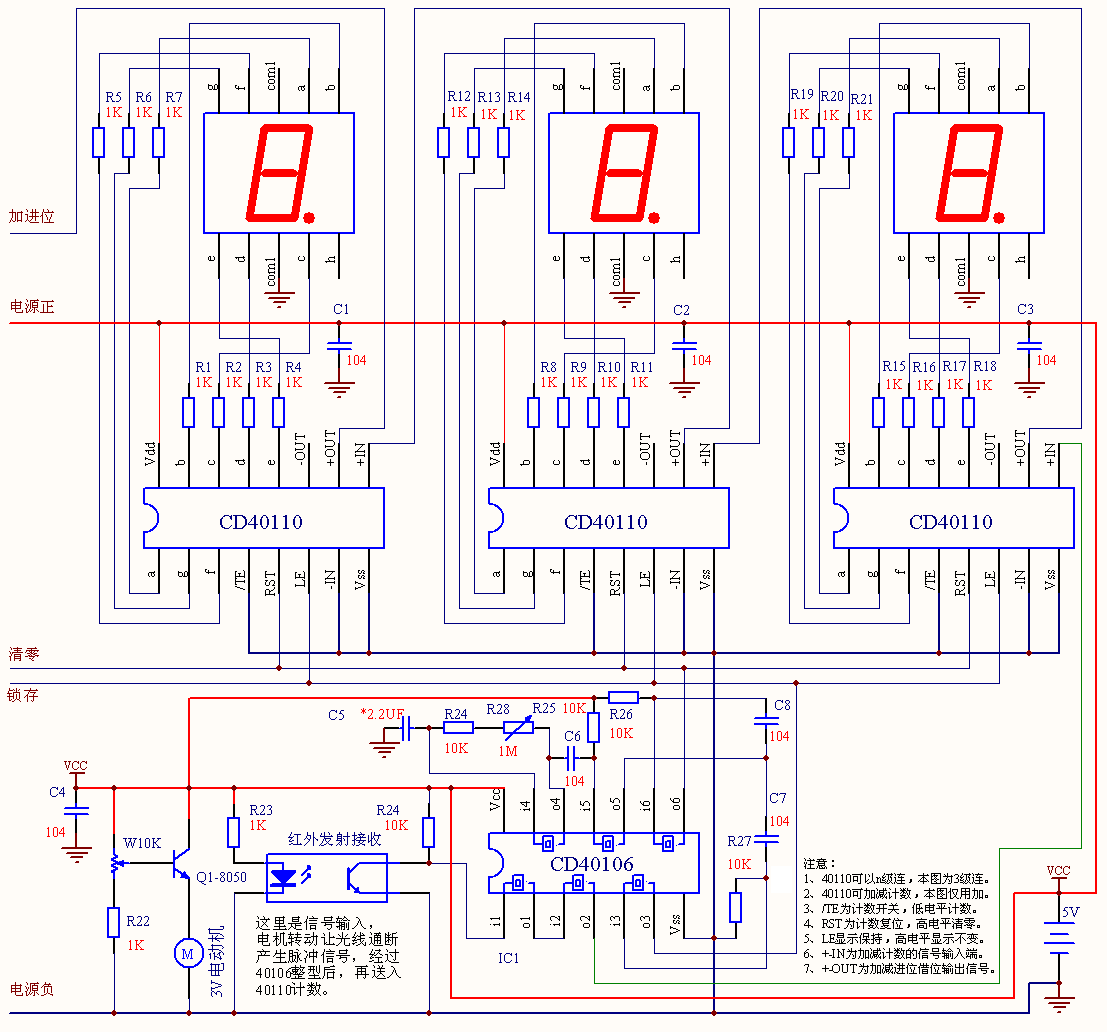 因此,CD40106不能用普通的反向器代替,仅管逻辑功能是一样,引脚排列、工作电压都是一样。图中,反相器1、反相器2为信号整型电路,将光电耦合器感应到的转动信号加到最低们的CD40110的加一计数端,这样,电机每转动一圈,收到1个信号(本制作会收到2个信号是在模拟转速加倍),这个整号会产生计数。信号一定要经过整形,因为CD40110内部没有迟滞翻转功能,当输入信号边沿变化较慢时,会产生多个连续计数失去准确性,从而失去计数意义。