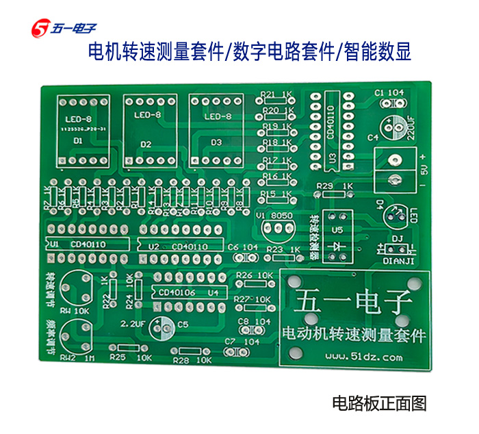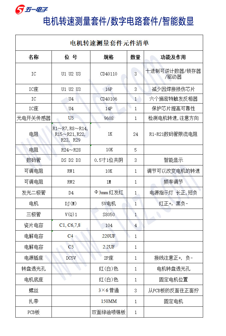 数字电路电机转速测量套件可以测量电动机每秒转动多少圈,最大测量范围每秒转动999圈,简单的修改电路,还可以当电子计数器使用。收到的实物包括印刷电路板(不要印刷电路板可配万能板)、小电机、电机转盘透光孔、光电传感器、3块CD40110、1块CD40106等看到的这些元件。