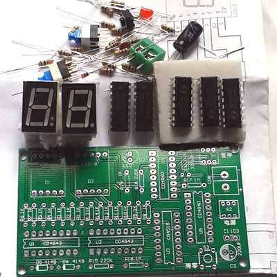 本套件主要元件有5个数字集成电路(CD4543 2个;CD4518 1个; CD4040 1个;CD4060 1个)、2个一位数码管和发光二极管、32.768HZ晶振,开关电阻及其它所有元件用胶袋包成一包,配上双面玻纤电路板,制作说明,元件清单,原理图,欢迎各位电子爱好者一起动手制作。