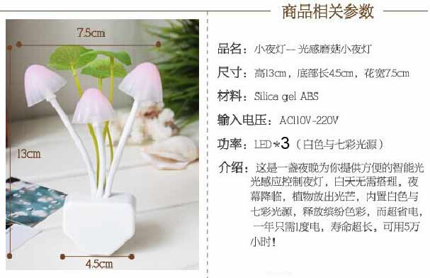 产品特点: 1.节能:小夜灯采用当今最流行的LED技术,超低的用电量,低至1年仅耗1度电。 2.智能:温馨智能的光控开关,根据环境光线的明暗自动开关,光控智能开关。 3.美观:可爱诙谐的蘑菇造型,改变了传统灯具的古板形象增添生活情趣,让您感受大自然风情。 炫彩光控小夜灯为夜间提供一个微弱的照明,当房间光线变暗的时候,炫彩光控小夜灯会自动发出柔和的光线,而当光线变亮的时候,炫彩光控小夜灯会自动关闭,为夜间行动提供一定的方便,同时为您的梦乡停留在美好的那一刻。 温馨提示: 本款小夜灯只有中间的灯是七彩渐变的哦,旁边2个灯是暖光不变色哦。